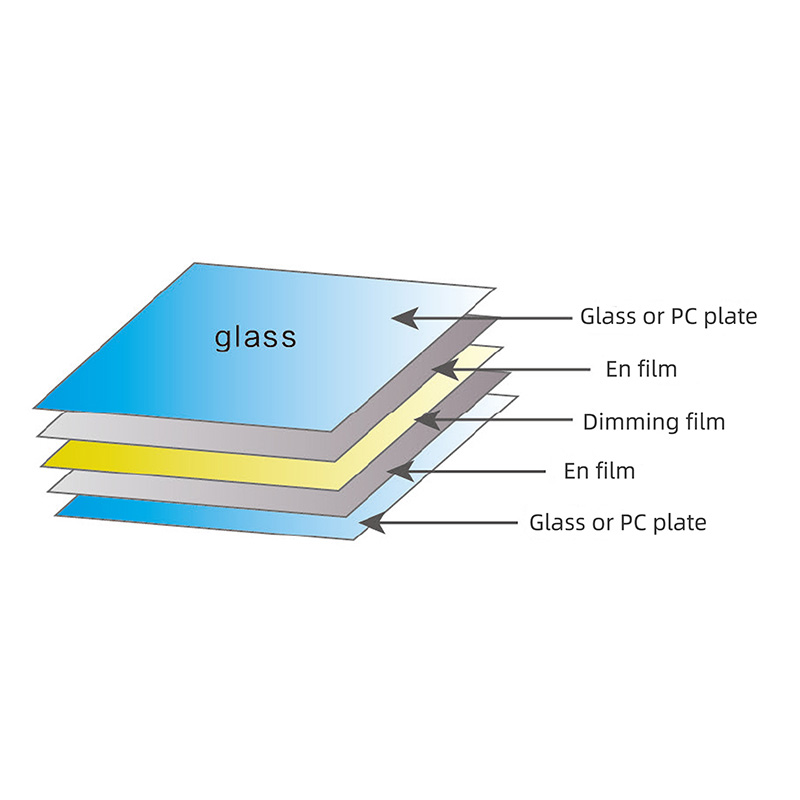 Is féidir an scannán dimming a dhéanamh i sraith de ghreamaitheach, is féidir a cheangal go díreach leis an ghloine, nó sandwiched idir dhá shraith de ghloine ag baint úsáide as próiseas lamination (is é sin, gloine dimming). Mar gheall ar an voltas a chuirtear i bhfeidhm ar an scannán dimming tá an chuma ar an scannán cliste trédhearcach nó ceo, a chomhlíonann riachtanais dhúbailte daoine maidir le treá gloine agus príobháideacht. Fiú nuair a bhíonn sé teimhneach, tá an soilsiú fós go maith, rud nach féidir leis na cuirtíní reatha go léir a bhaint amach.